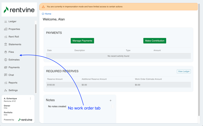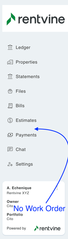 If this is toggled to No, this means the owner will not see the Work Orders Tab, and it will entirely disappear from the Users portal