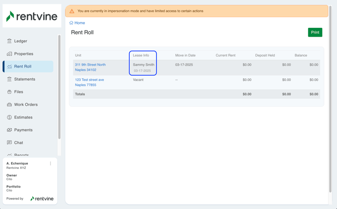 - Show Tenant Names - This allows the Owner to see the Tenant's name on the Rent Roll Tab