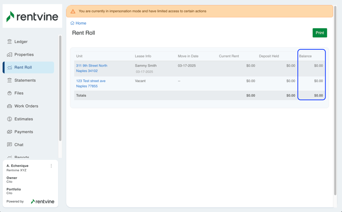 - Show Lease Balances - This allows the Owner to see the Balance on the Rent Roll Tab