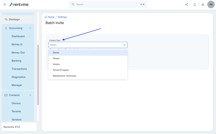 - This allows you to select a specific Contact Type, either vendor, owner, or tenant