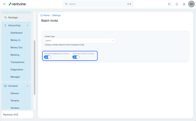- Once the type is selected, you can also toggle if you want to exclude Registered Contacts & Excluded Invited Contacts