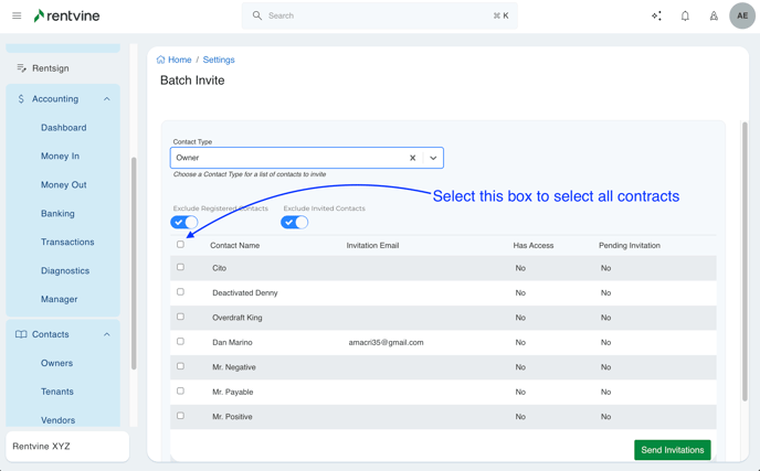 - This will show all contacts for this type for the toggles you have enabled, and from here you can select either all contacts by clicking the top checkbox, or select individual contacts, and you can send a mass invitation to these contacts all at once here