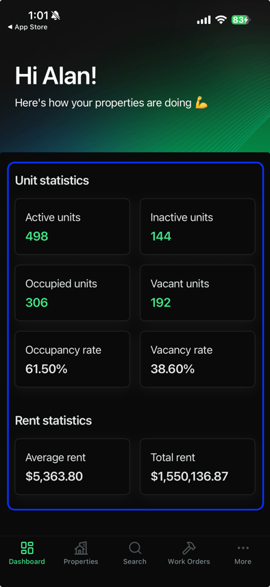 The Dashboards Tab will show you the current Unit Statistics and Rent Statistics for your Rentvine account.