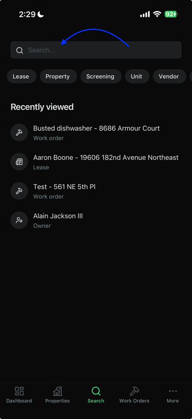 - The Search Tab functions as the global search in Rentvine. This will also display your most recent searches for quick access.