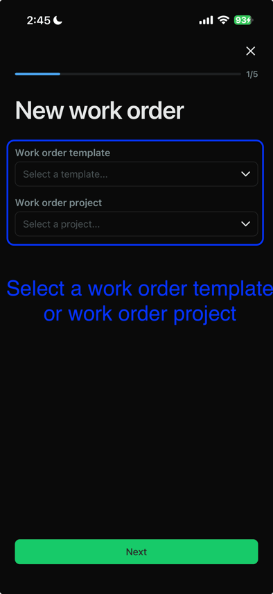 - Select if you are applying a work order template to the new work order or if you are adding the work order to an existing project