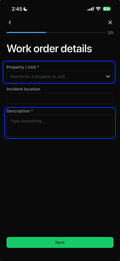- Select the Property/Unit this is meant for, and a brief description of the work order.