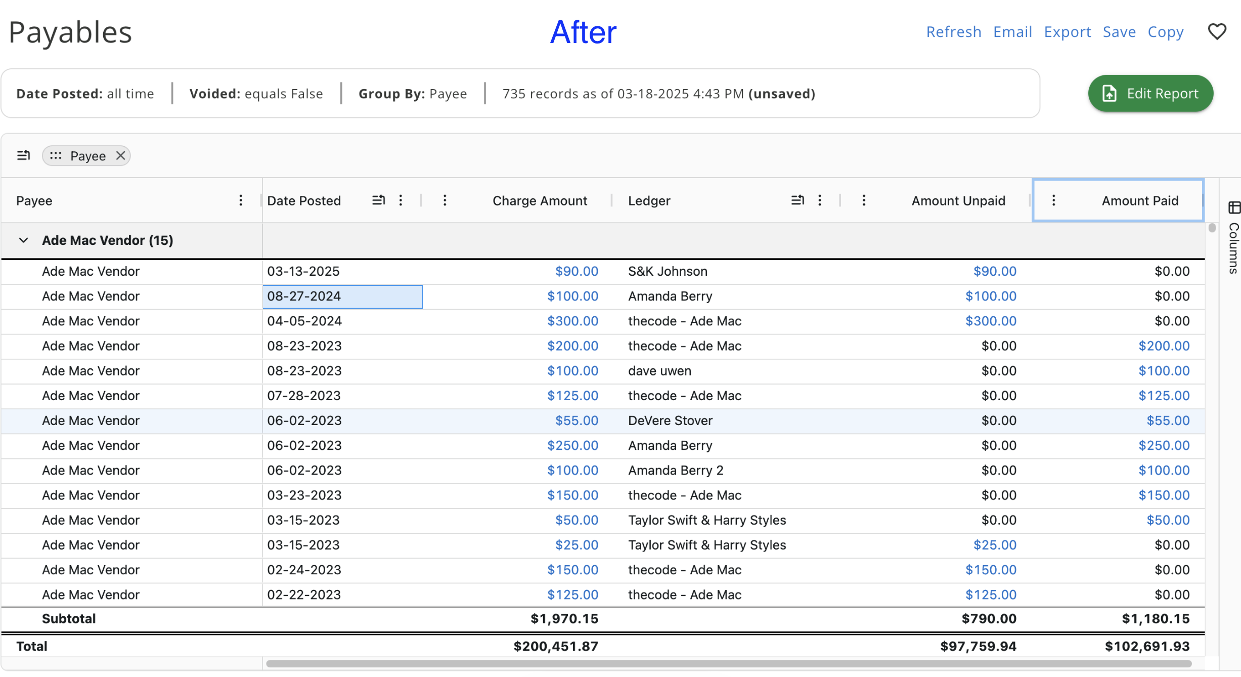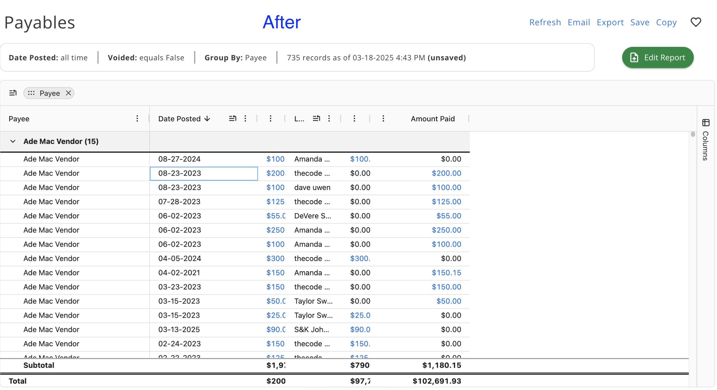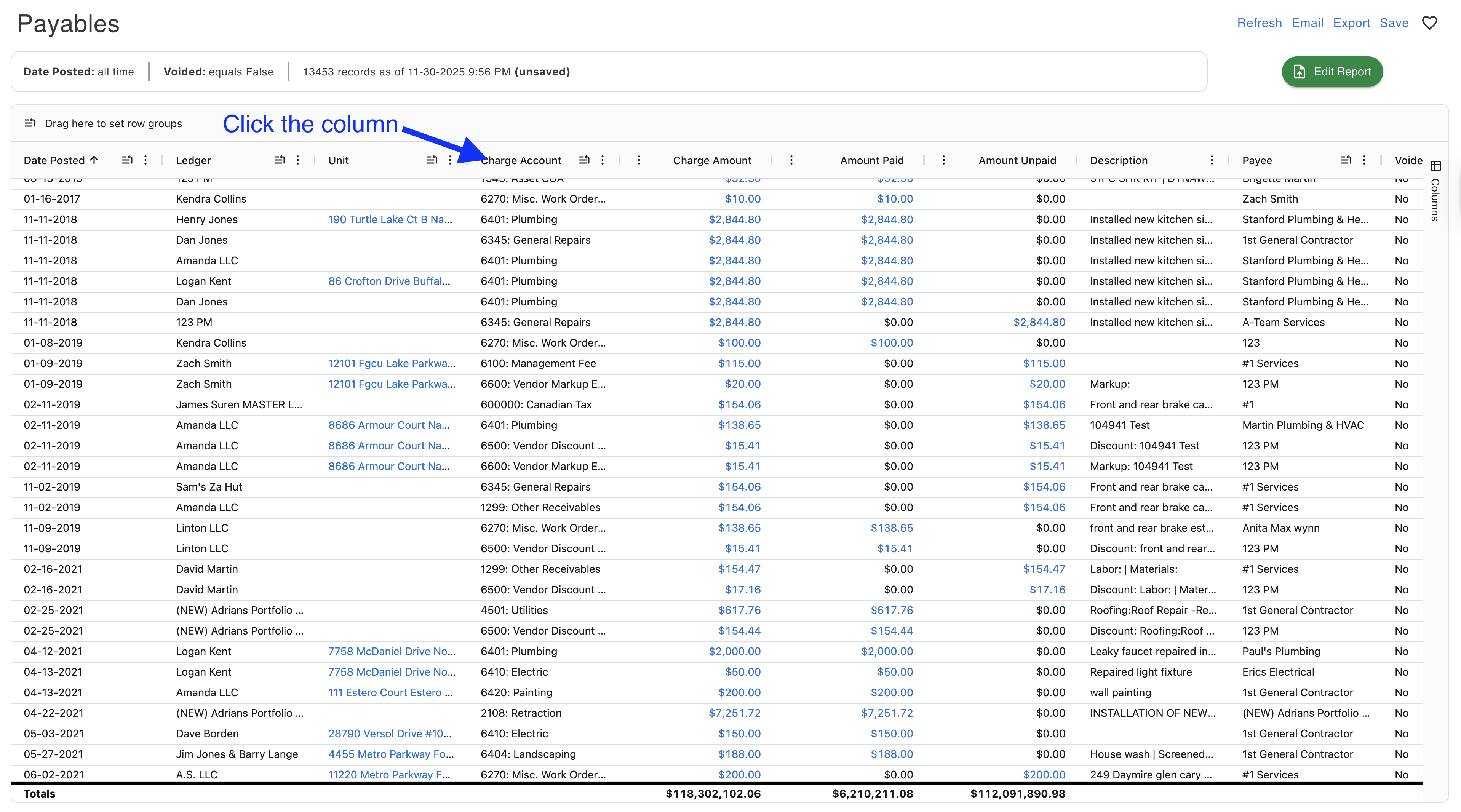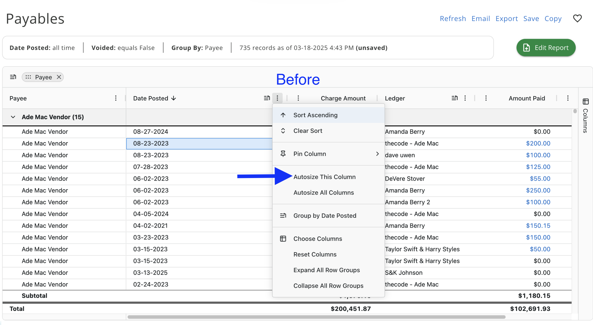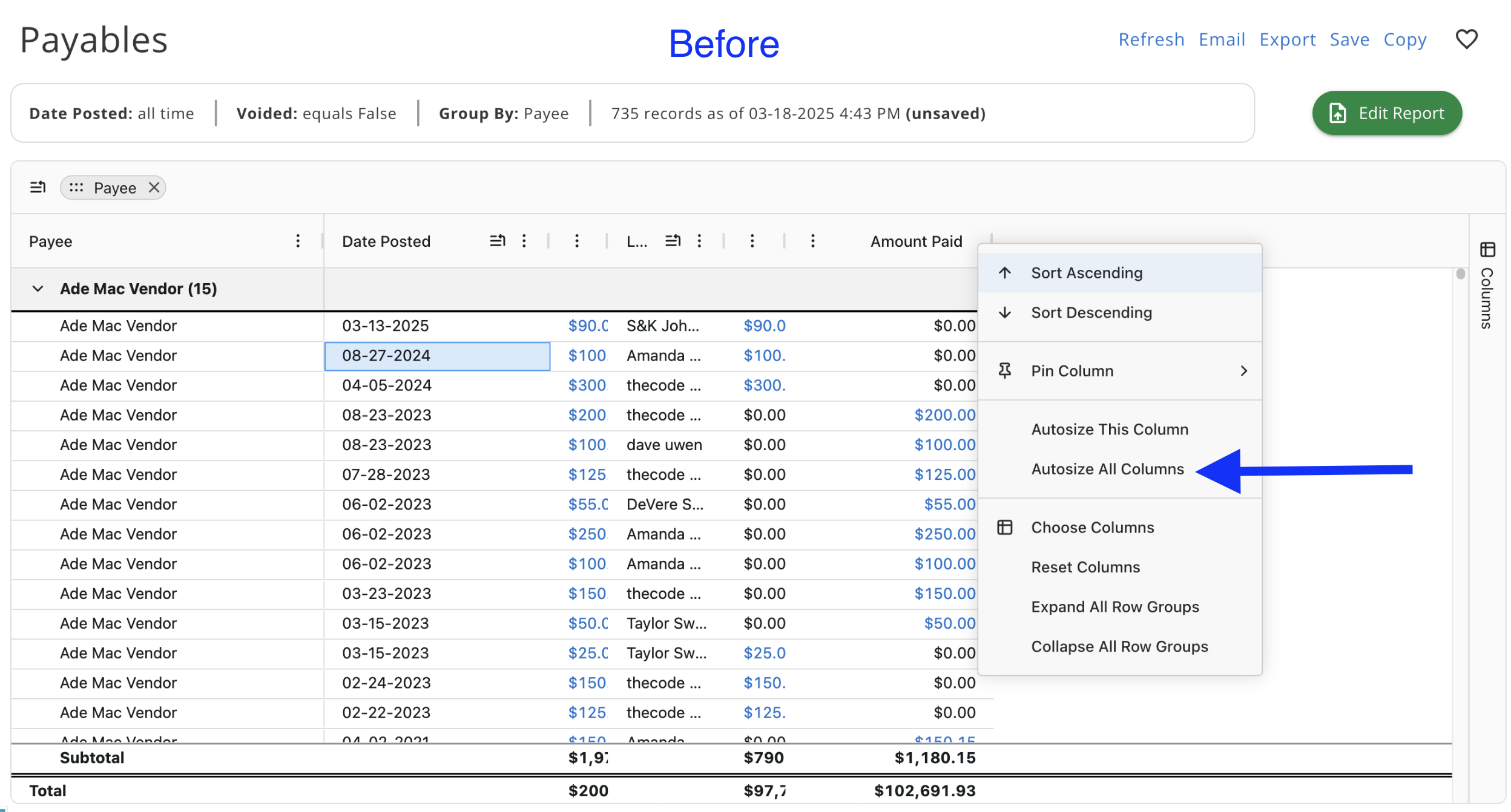 - You can also resize the columns to your liking now and autosize the column itself or all columns on the report.
