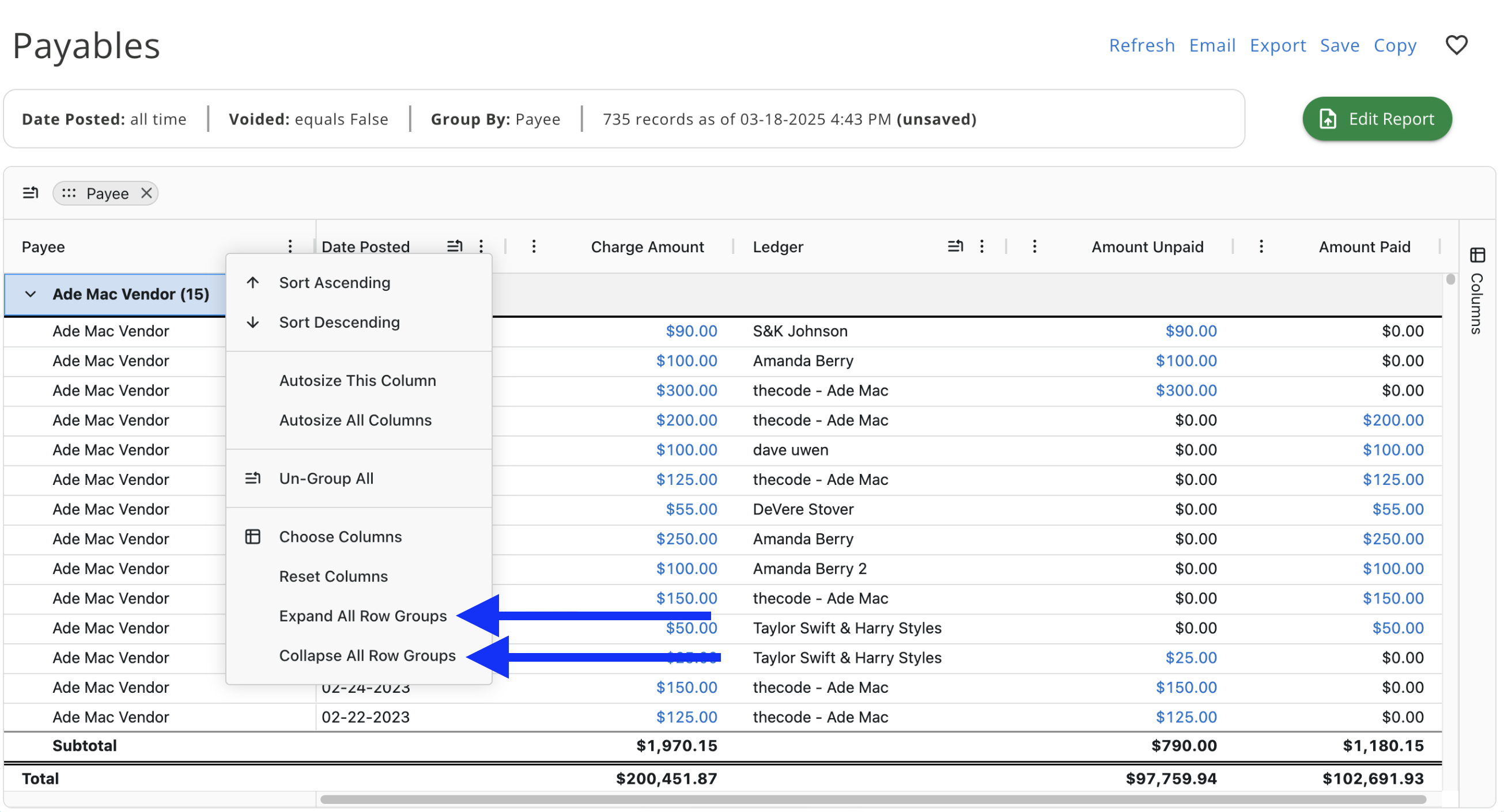 - You are also given the option to collapse all rows in the report and expand all rows