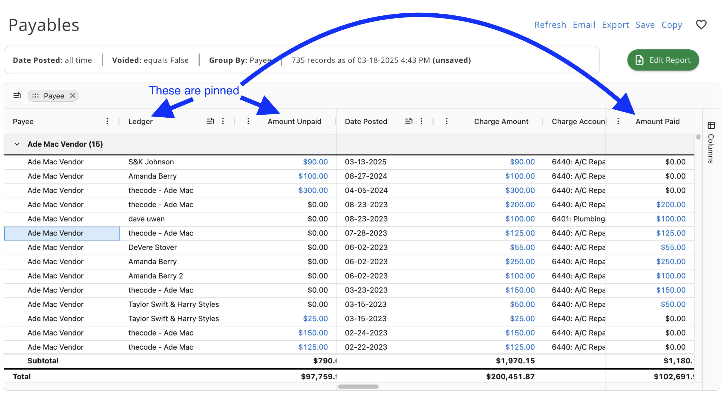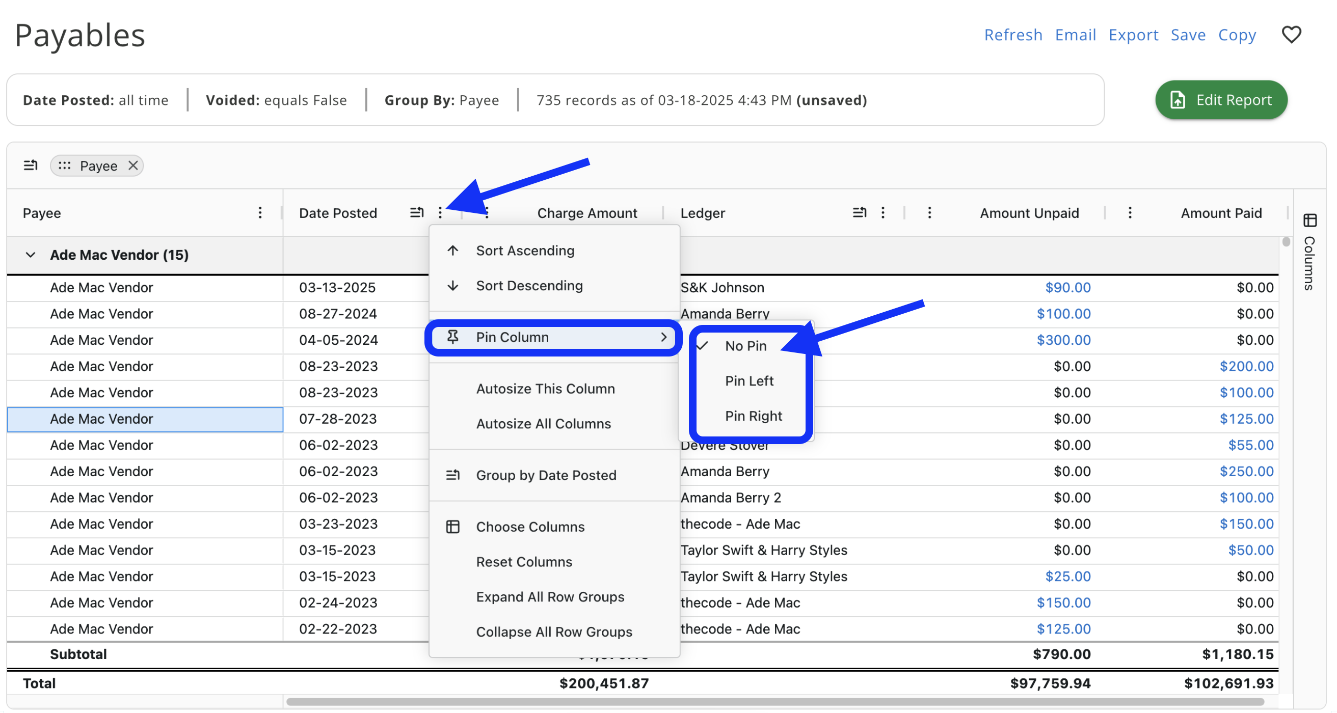 Column Pinning - This feature allows you to now pin specific columns in the report either to the left or right, or you can remove the pin entirely from the column