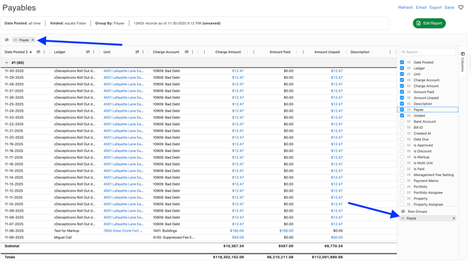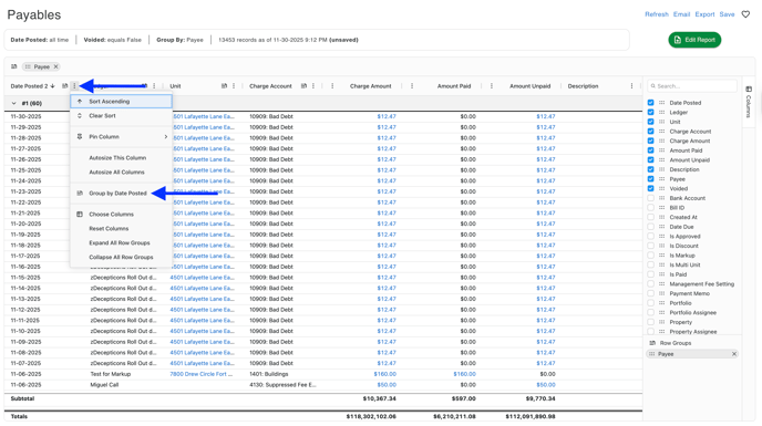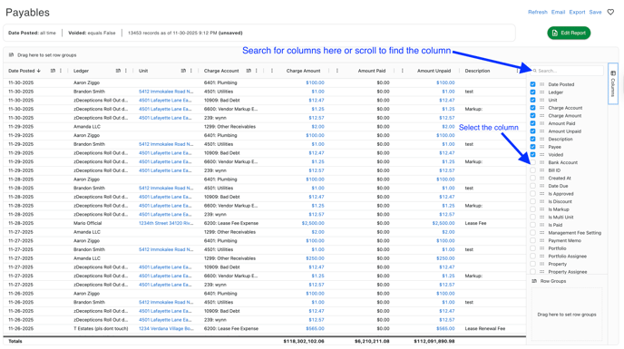 Adding Columns and Grouping to a report - If you would like to add Columns to the report, you can do this by clicking the Columns tab on the right side of the screen and toggling which column you would like to activate. This will automatically update the report results.