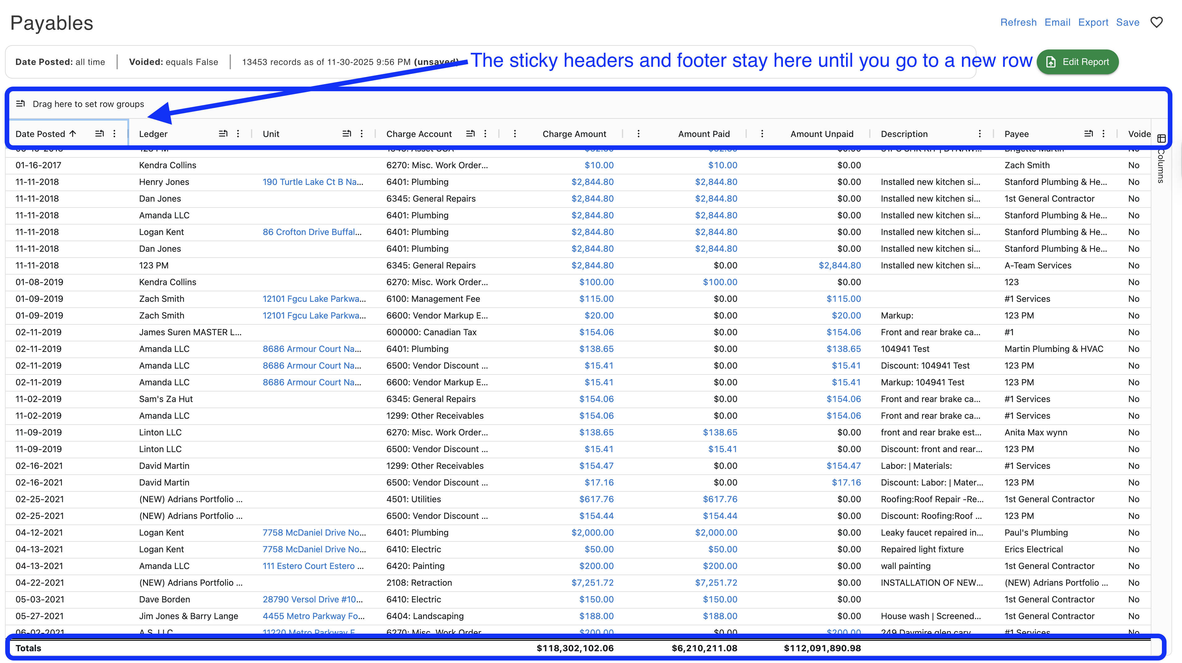 The Sticky Header & Footers are designed so you no longer need to scroll towards the top to double-check which value falls under a specific column and no longer need to scroll down to find the total value for a specific grouping or total balance of a column.