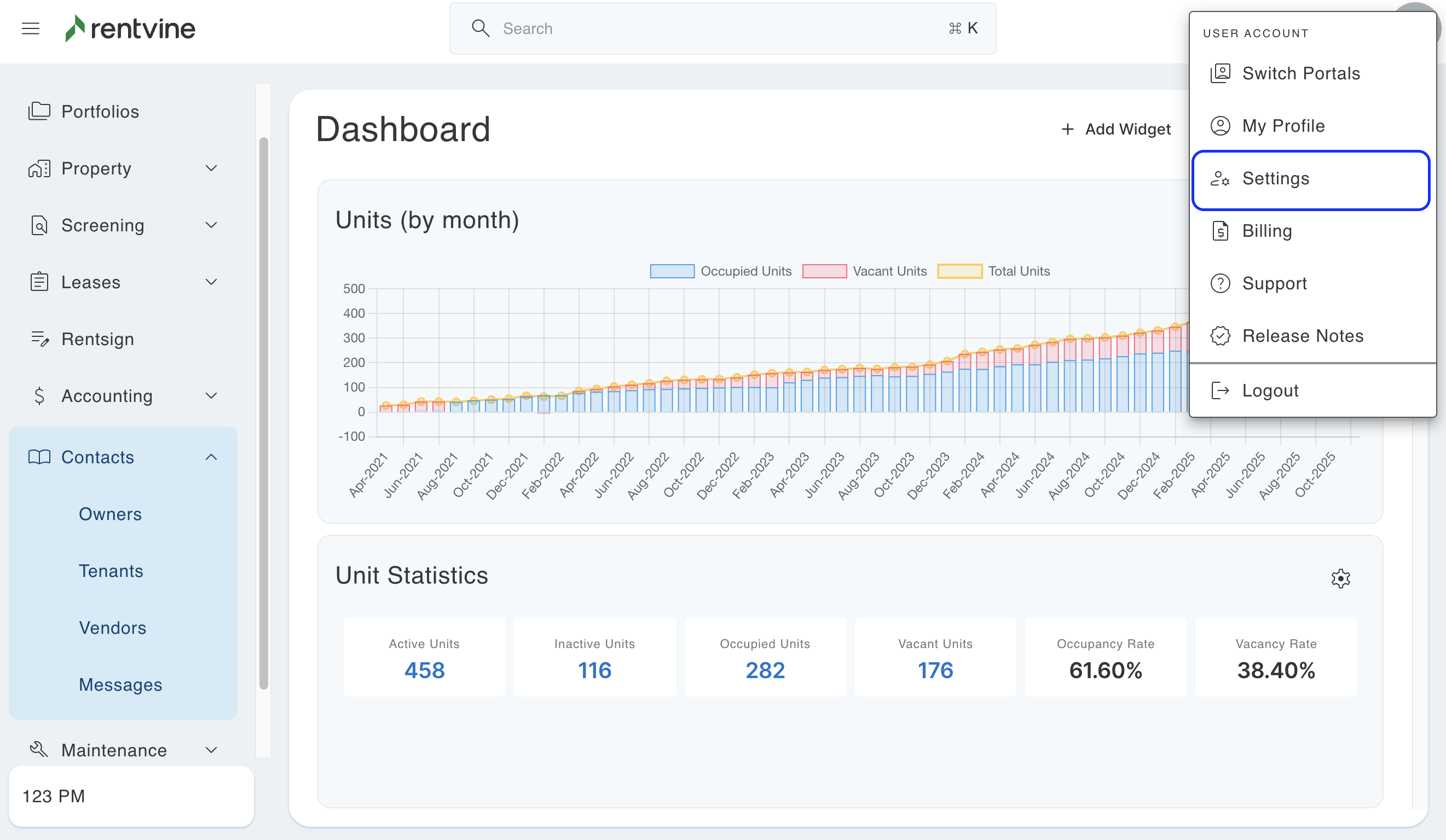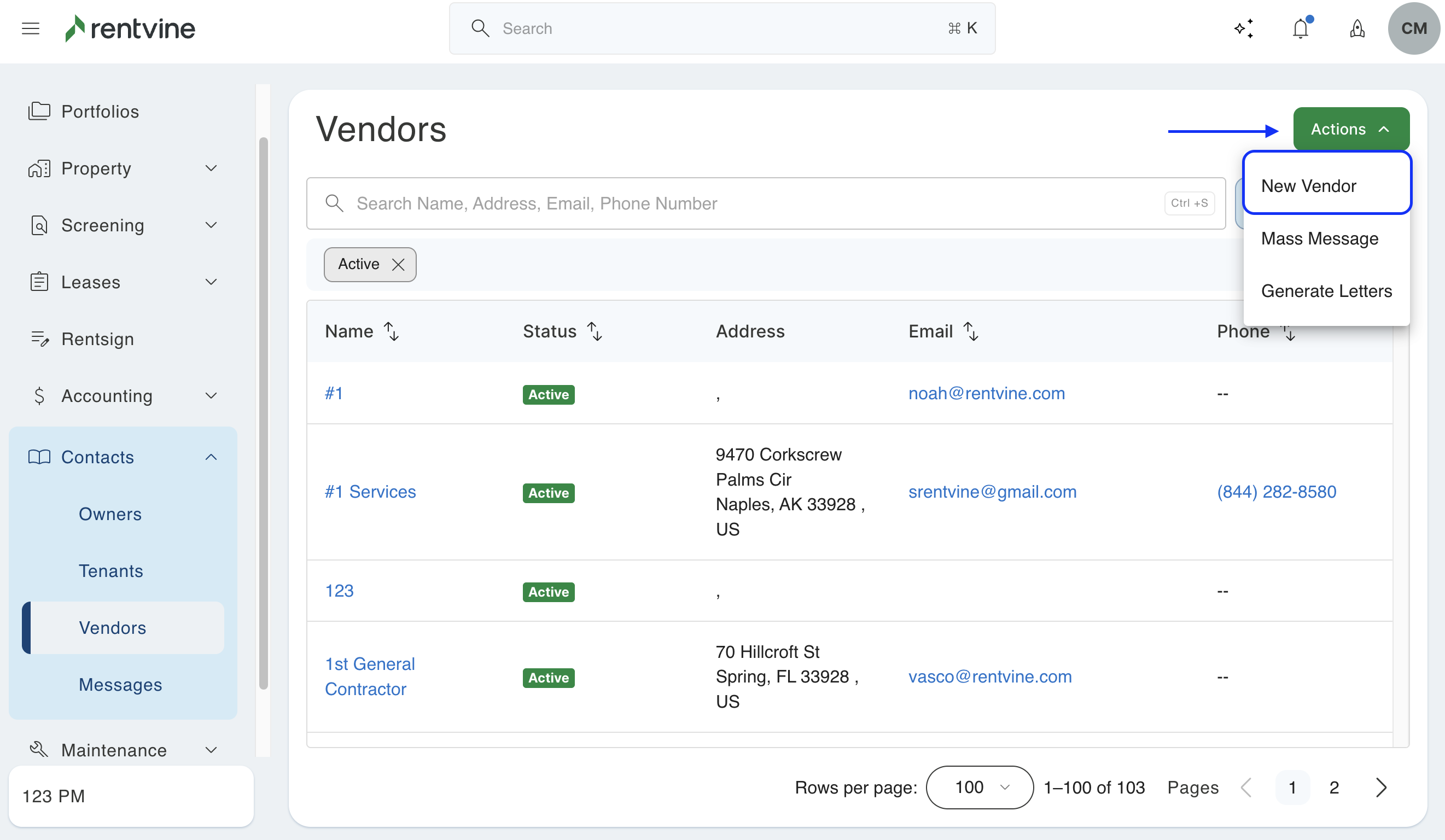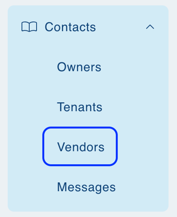 - Before creating your tax withholding settings, create the tax agency as a vendor. Navigate to the Contacts section of Rentvine and select Vendors.