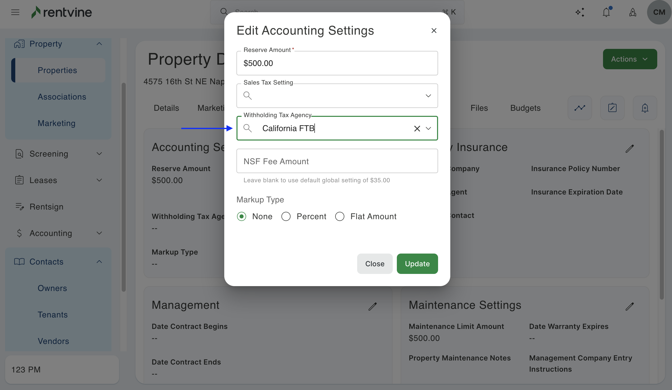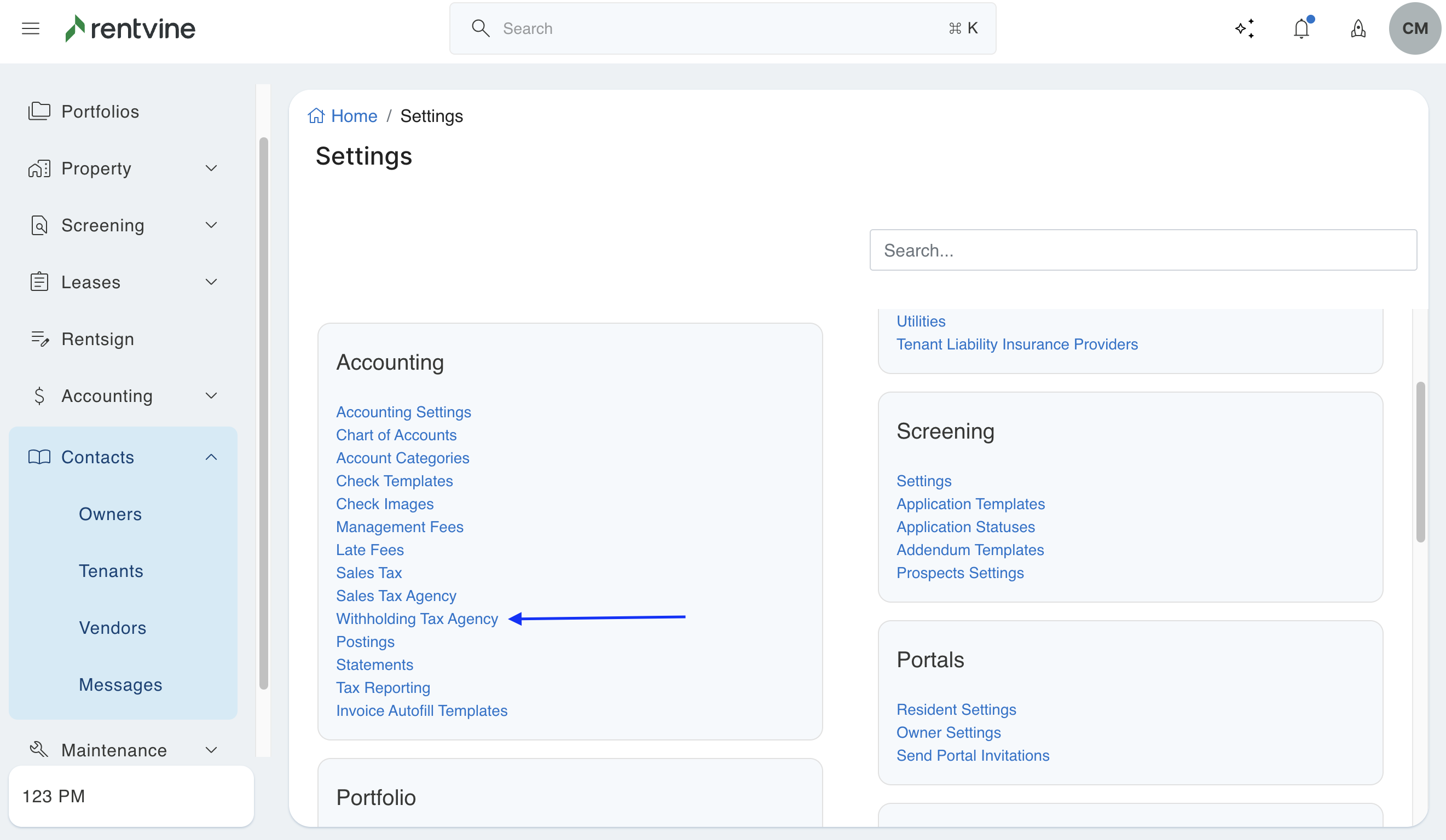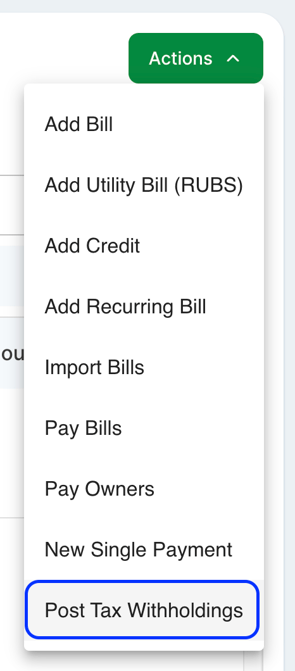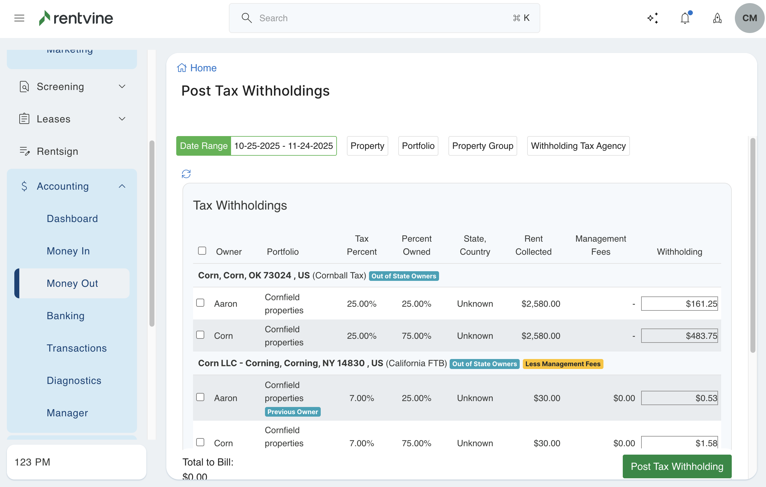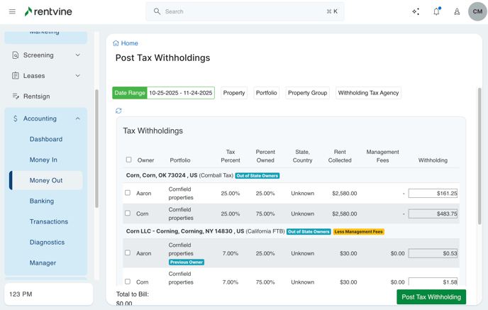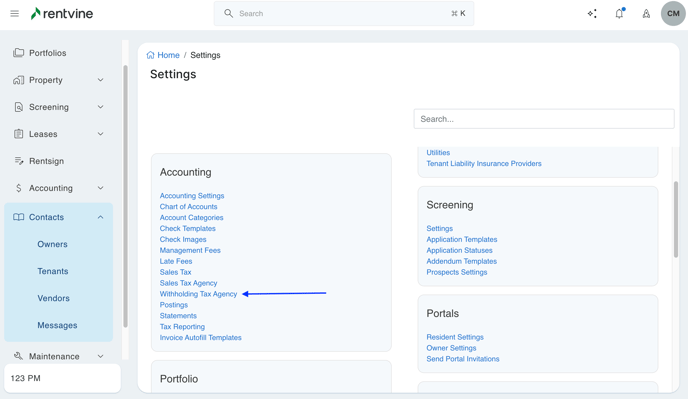 In Rentvine, you can configure and post tax withholding according to your state's requirements. The steps below will show how to create the tax withholding setting and post the tax withholding for the applicable properties.