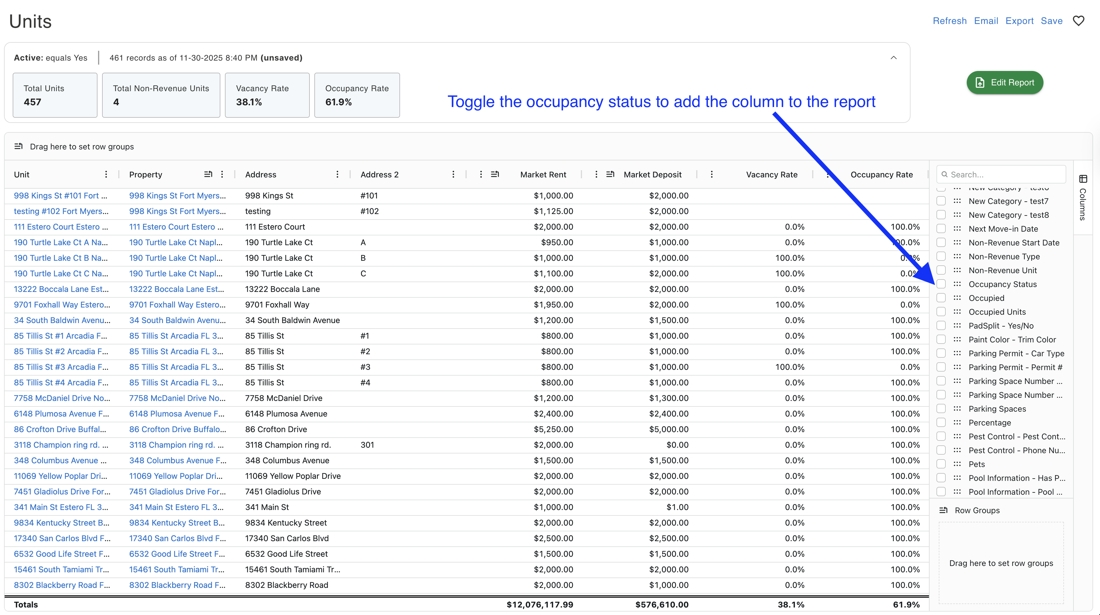 - Customize the report by clicking on the Columns tab and then toggling the Occupancy Status column to add that column to the report.