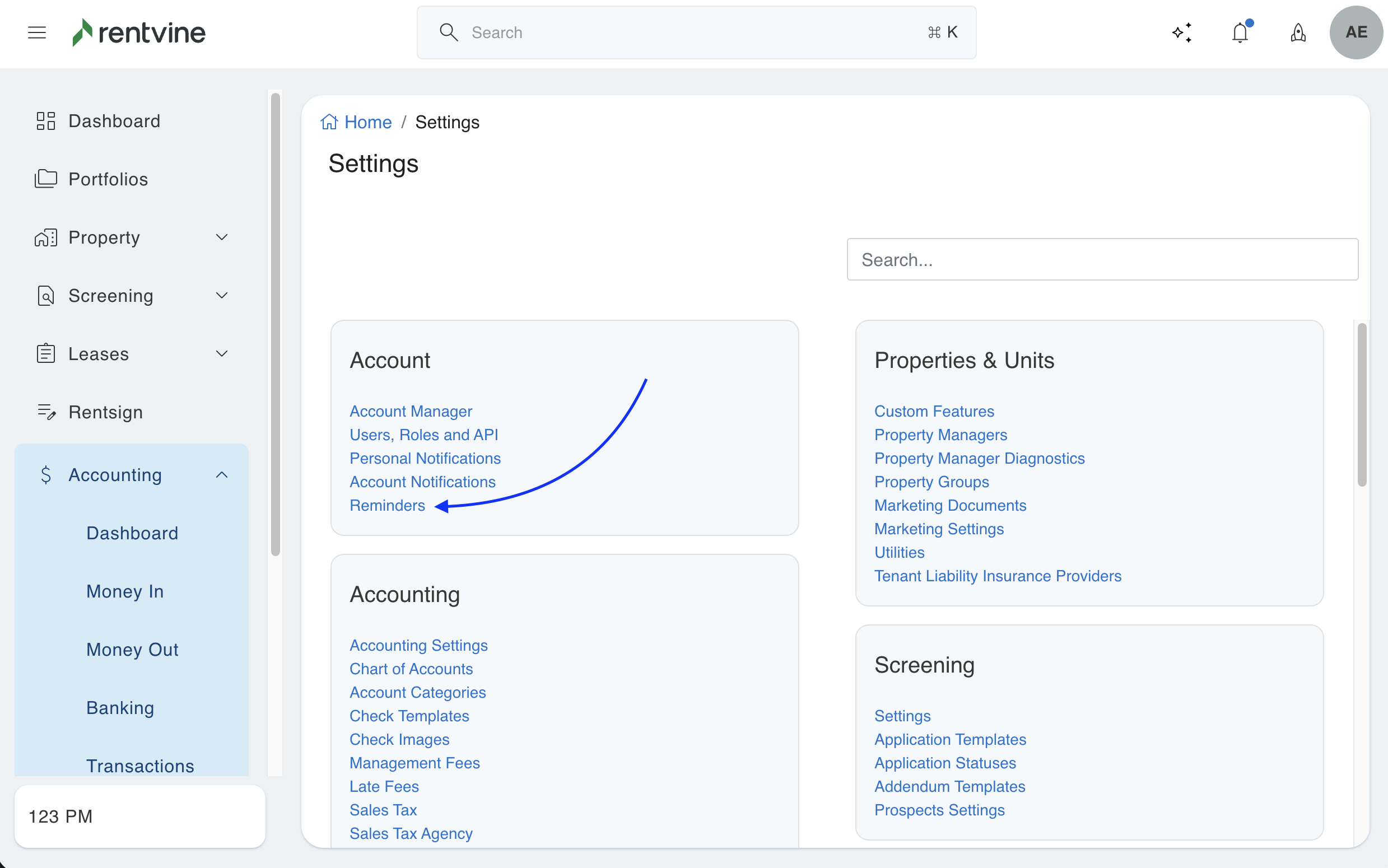 The accounting toggles are going to give access to certain actions within the "Accounting" tab of your Rentvine account. These include different tabs such as the Money In, Money Out, Banking, Transactions, Diagnostics, and Manager.
