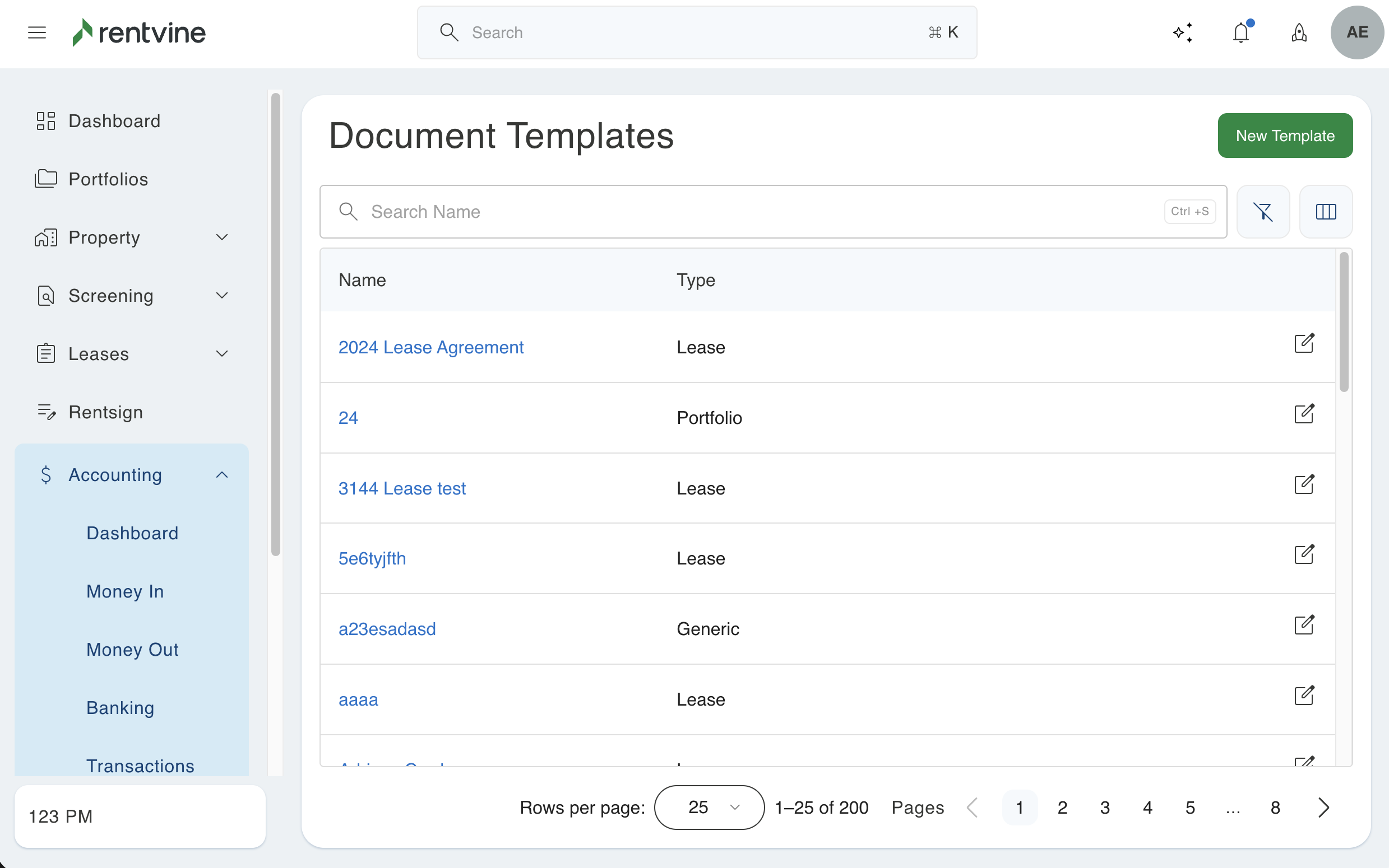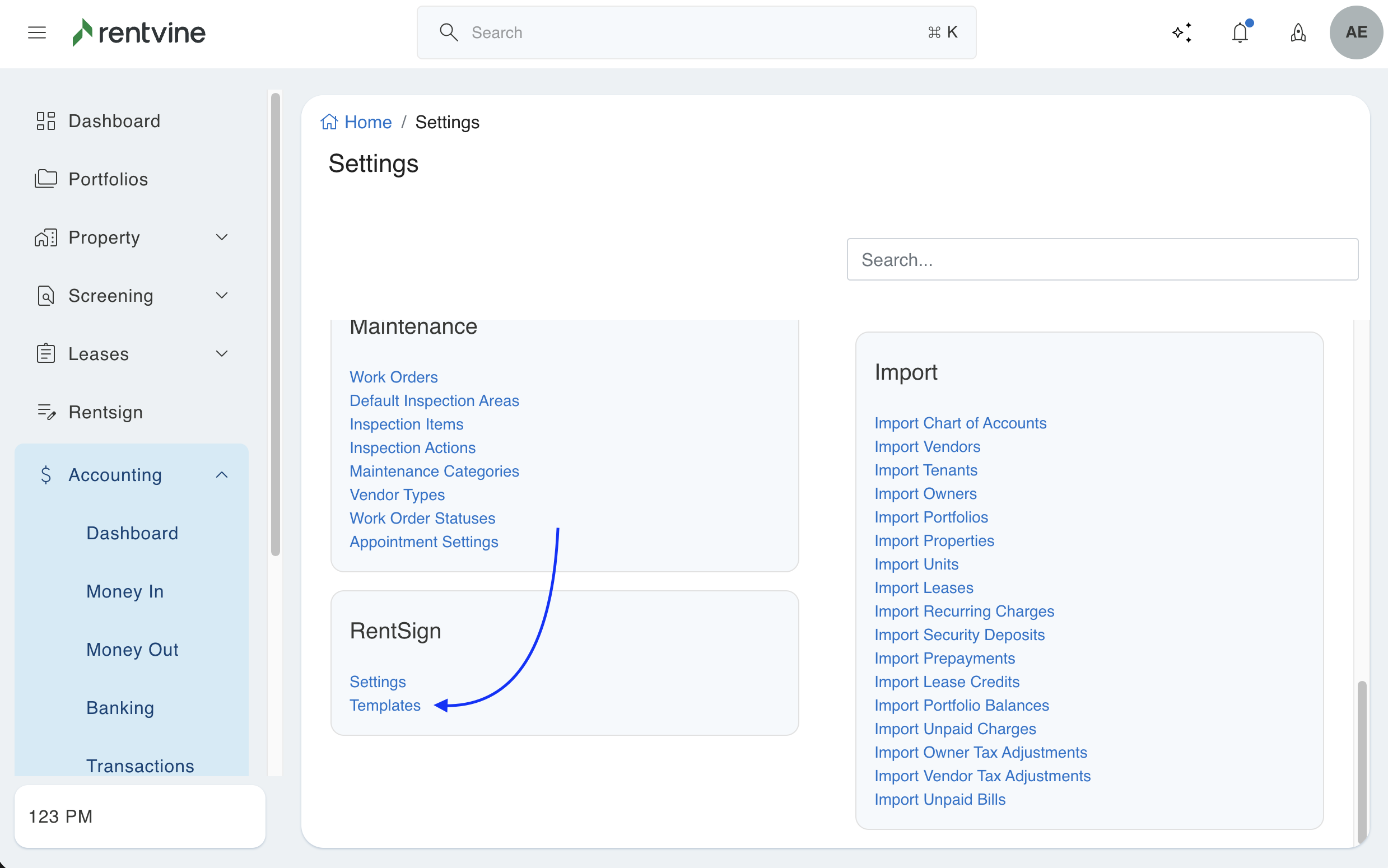 - Manage Templates - This allows the user to adjust the Rentsign Templates in Rentvine using the builder