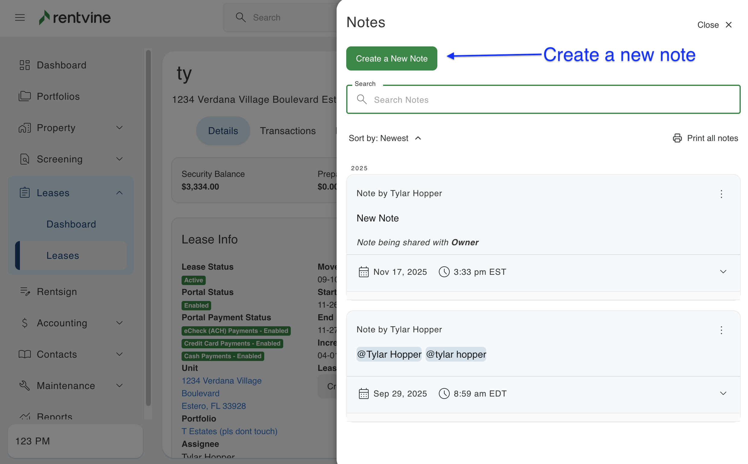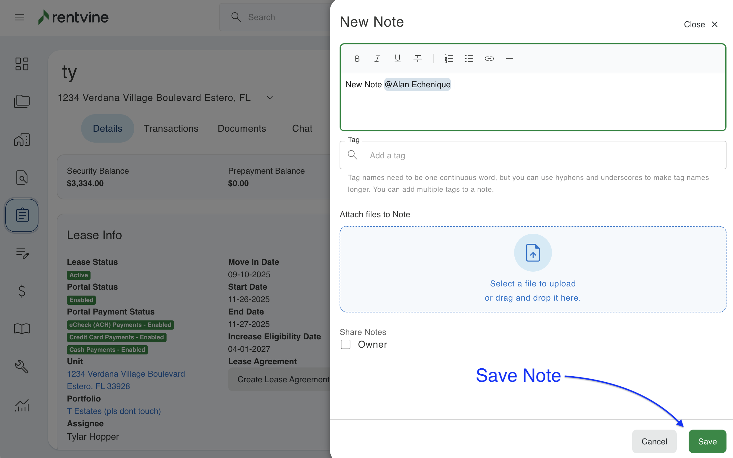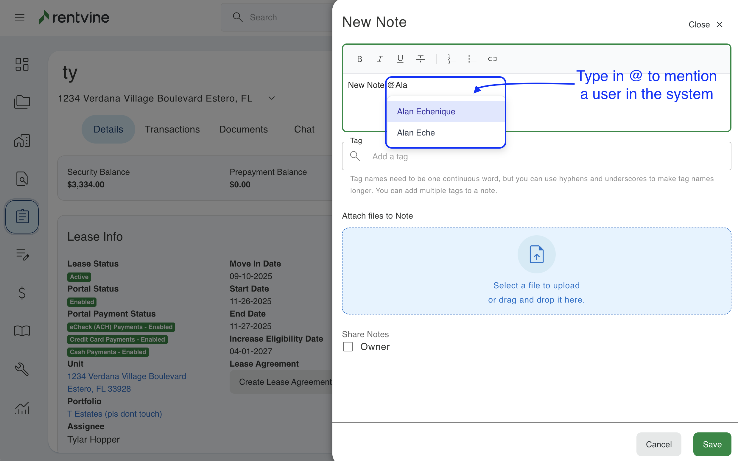 This article will show you how to utilize the Mention feature in Rentvine to alert other users if they are mentioned within a note.