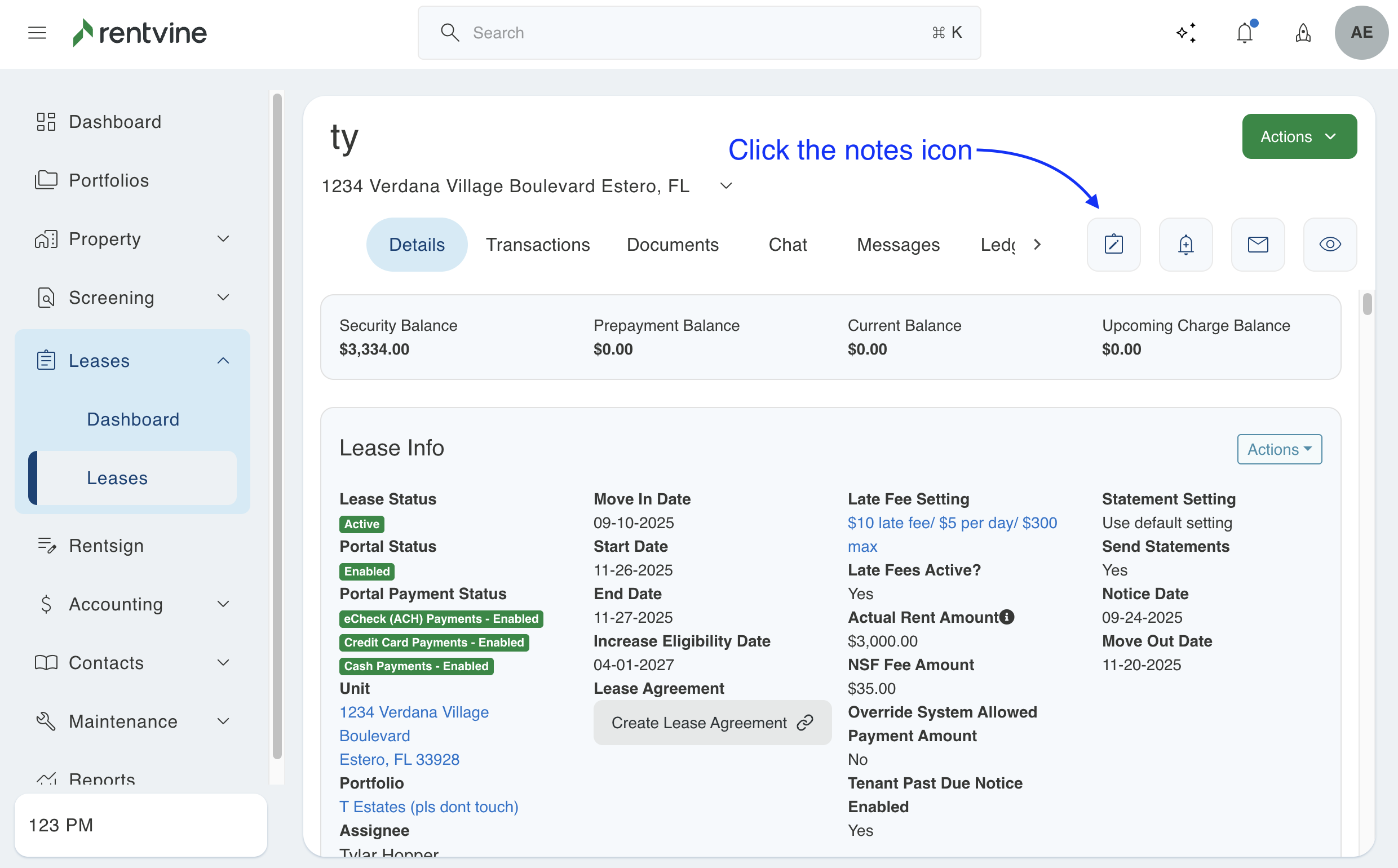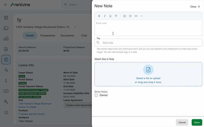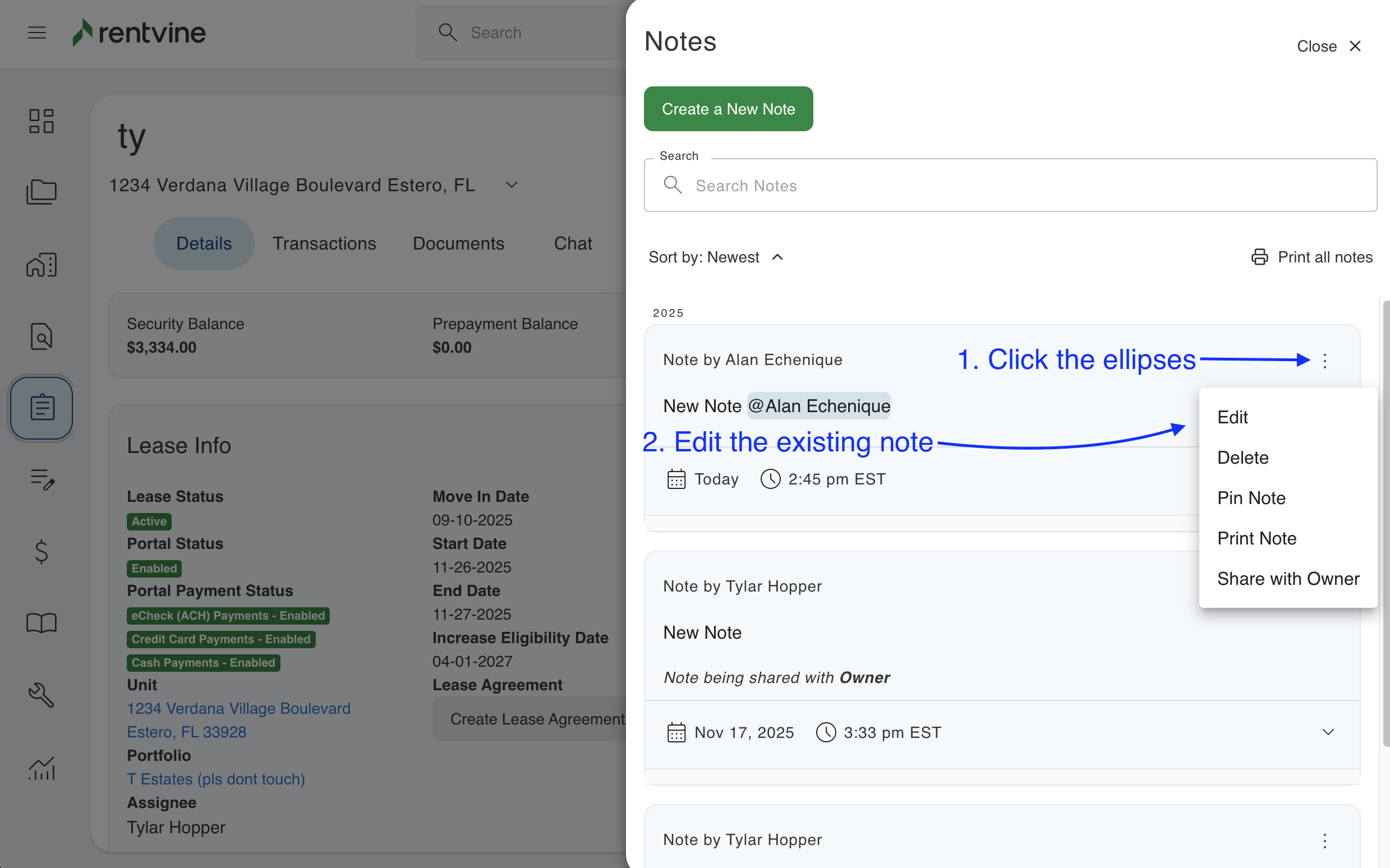 This article will show you how to utilize the Mention feature in Rentvine to alert other users if they are mentioned within a note.