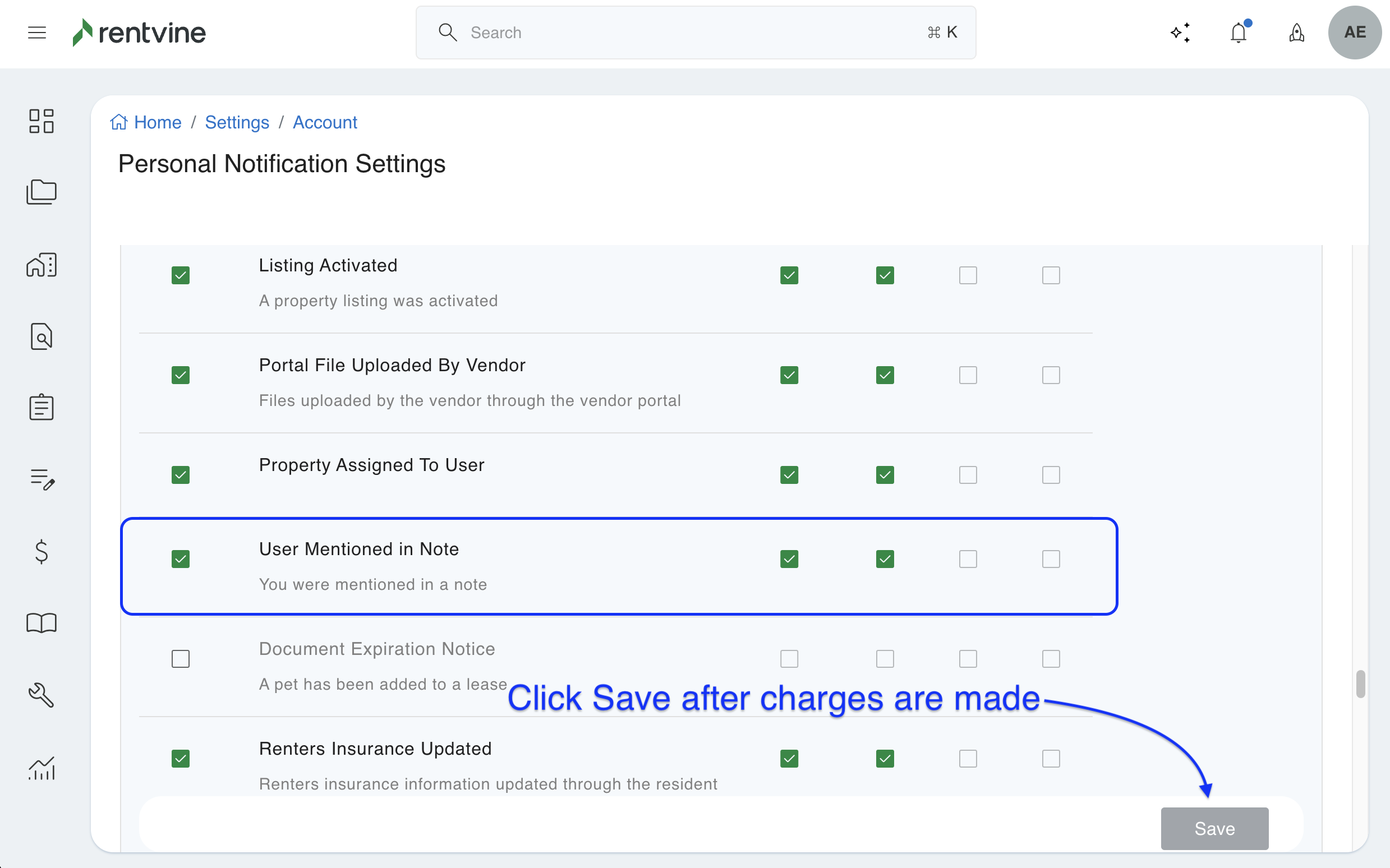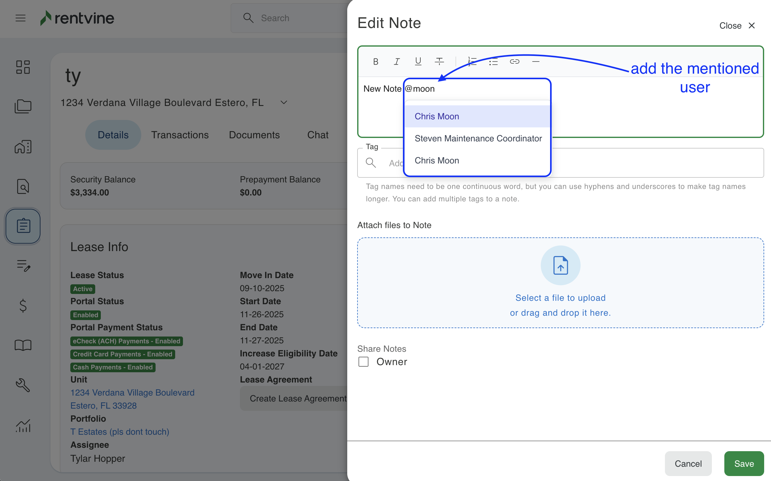 - The Mention feature allows you to type a user's name within a note and notify the user based on their personal notification settings. This can be applied to any note type in the Rentvine Software.