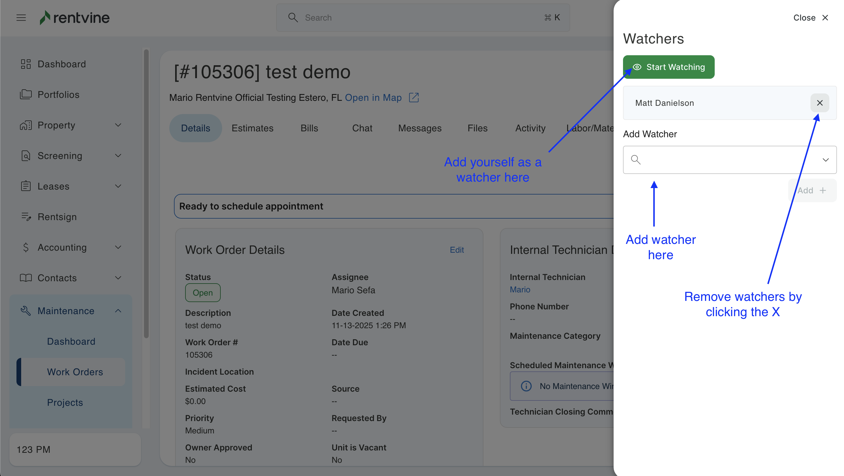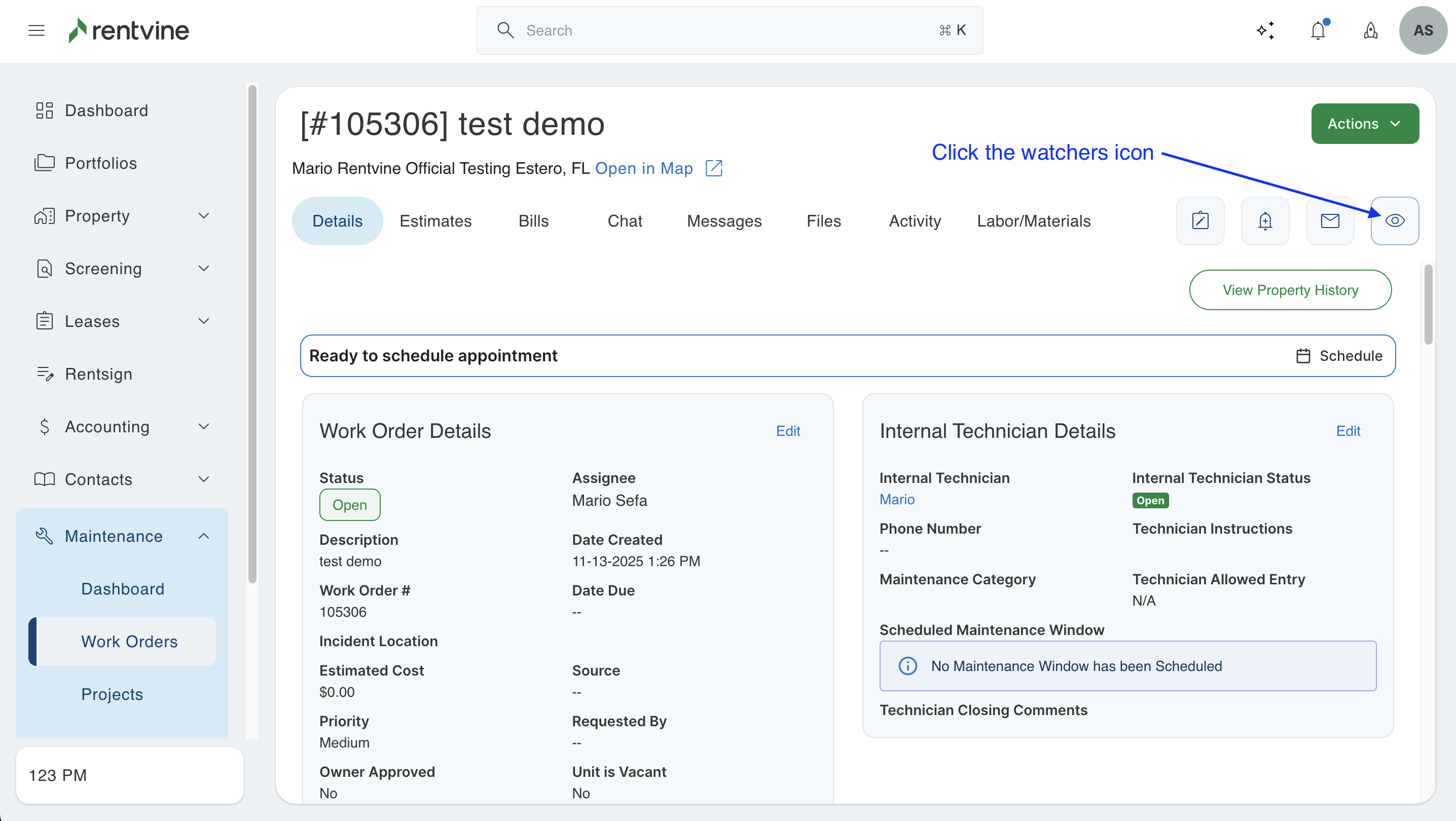 - To add a watcher to a work order, you can go to a specific work order. On this page, you can click the two blue arrows in the top right to pull out a sidebar. In here, you will see a "Watchers" tab that you can click to drop down.