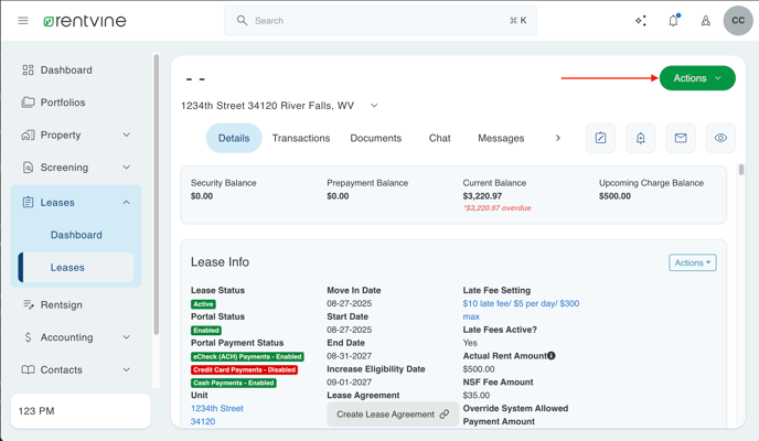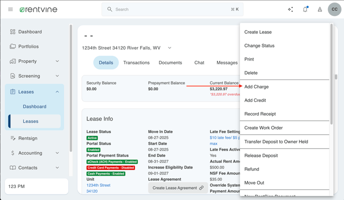 Step 1: Add a charge on the lease if it has not already been created. If there is already an unpaid charge on the lease that you are trying to record was paid outside the system, skip this step.