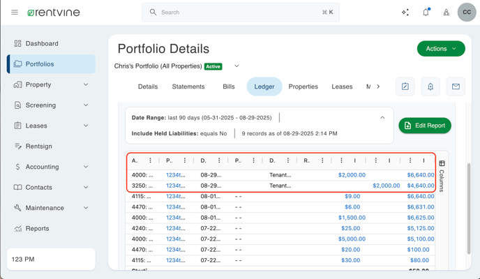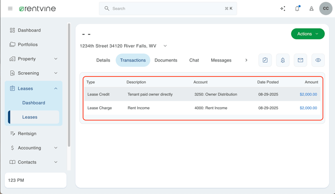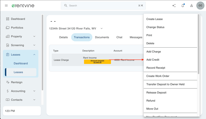 You will see the unpaid charge paid off using the credit you have just added when going into the transactions tab of the lease. Additionally, you're able to see the charge being washed off on the portfolio ledger as well.