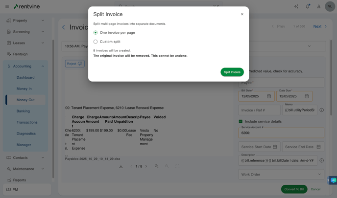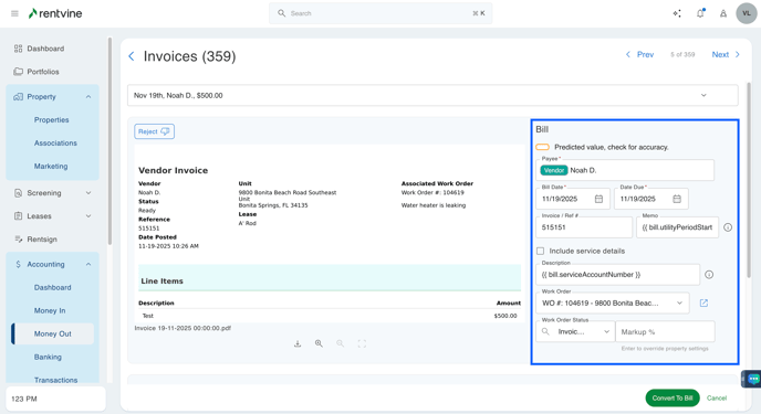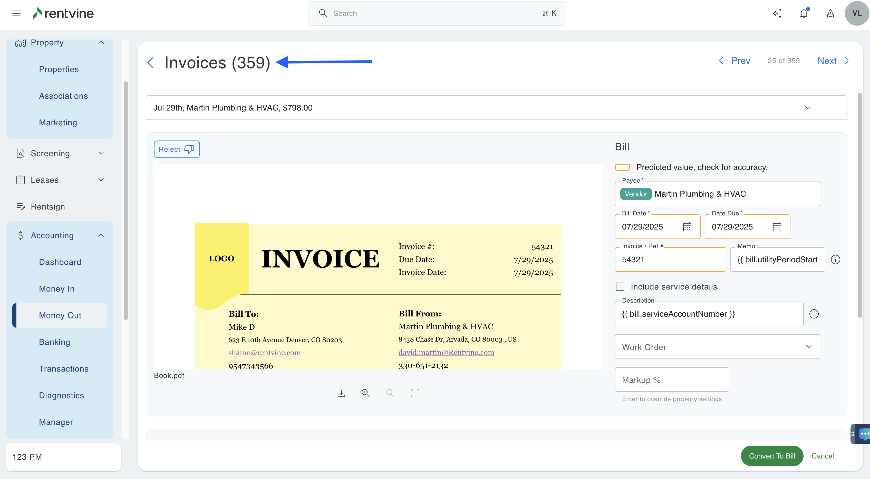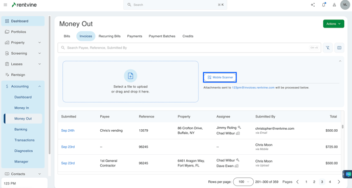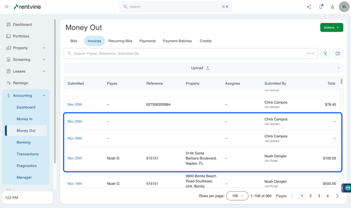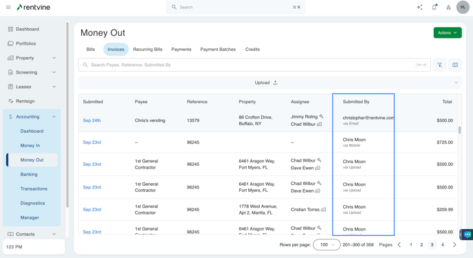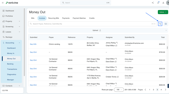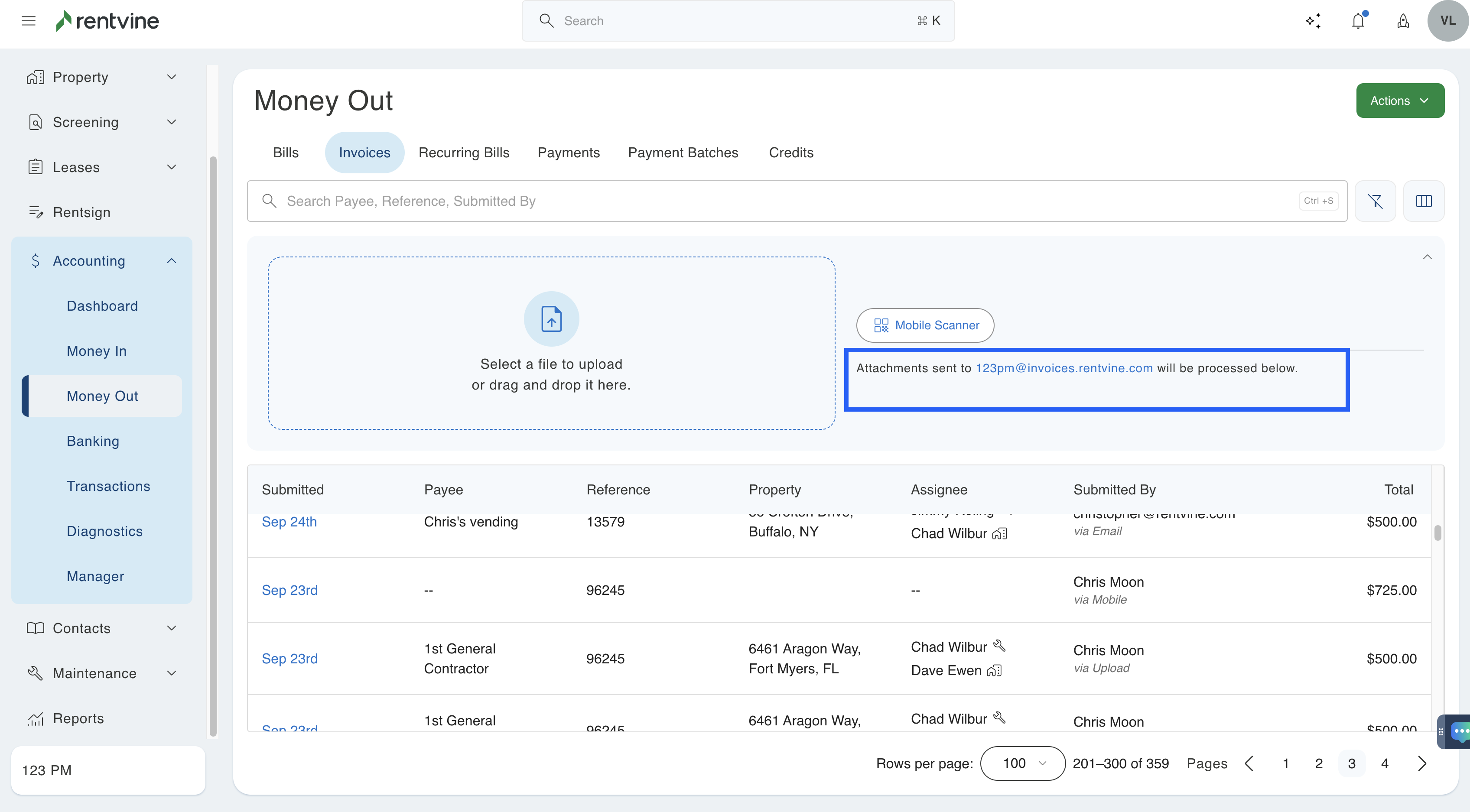 - Within the accounting money out tab, navigate to the vendor invoices page to view all invoices submitted by the vendor or manually uploaded into Rentvine by a user.