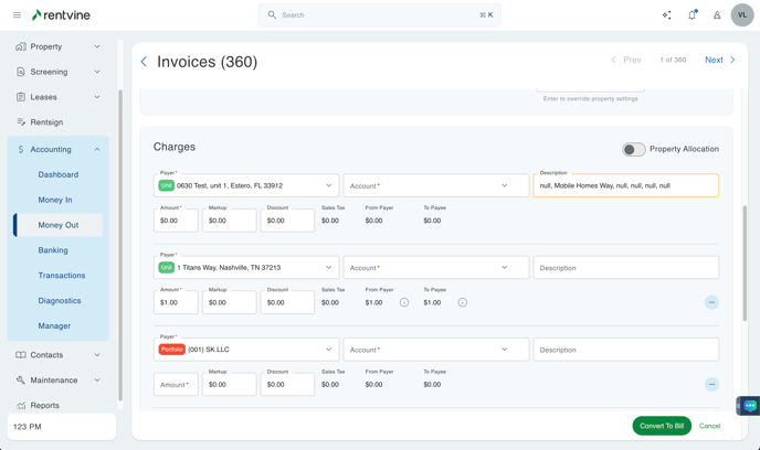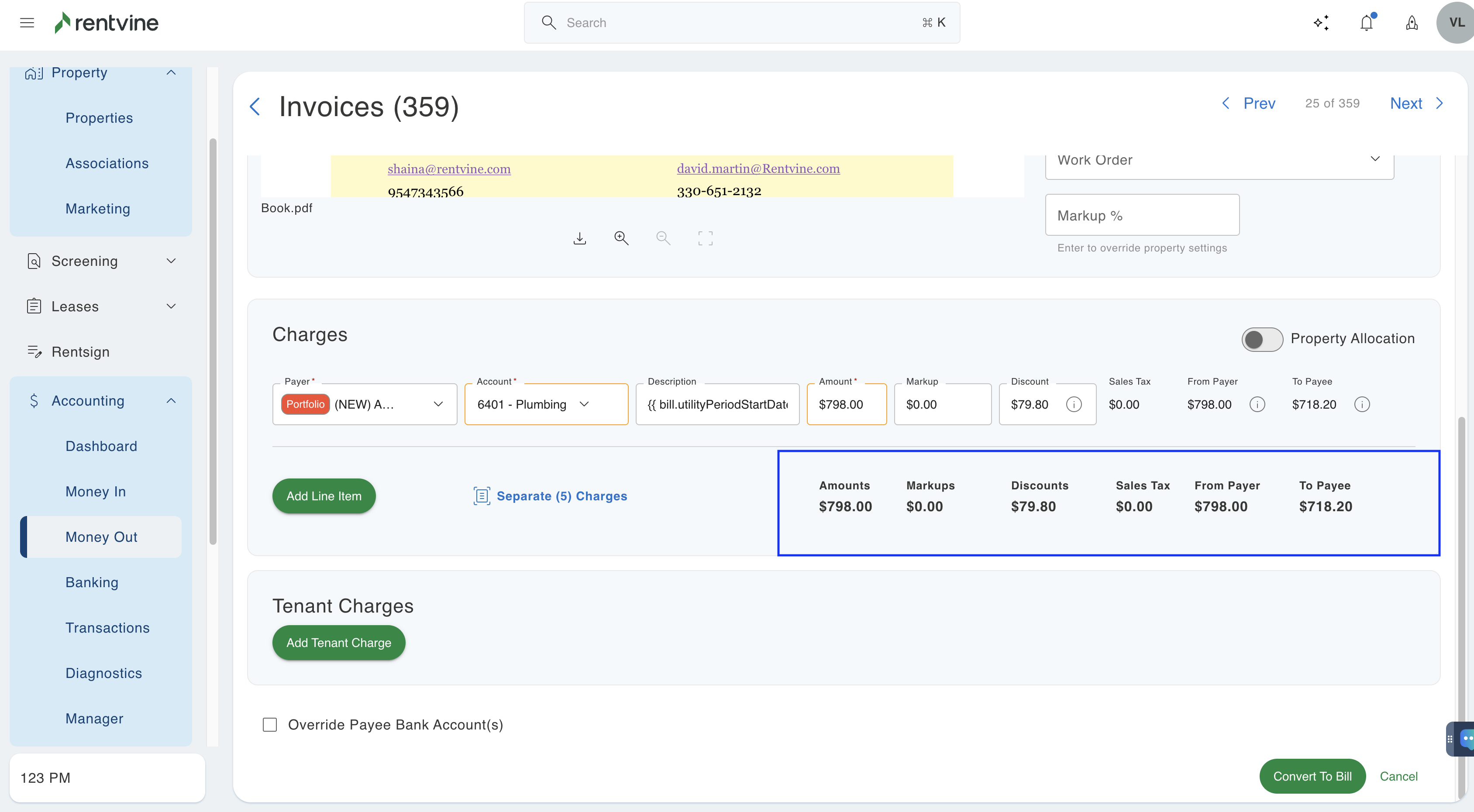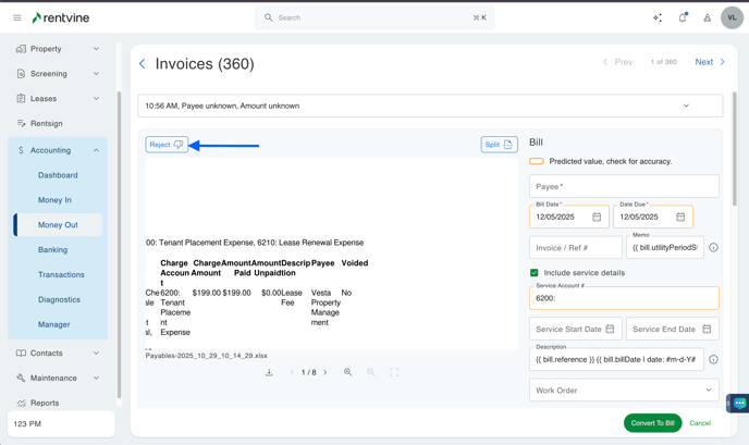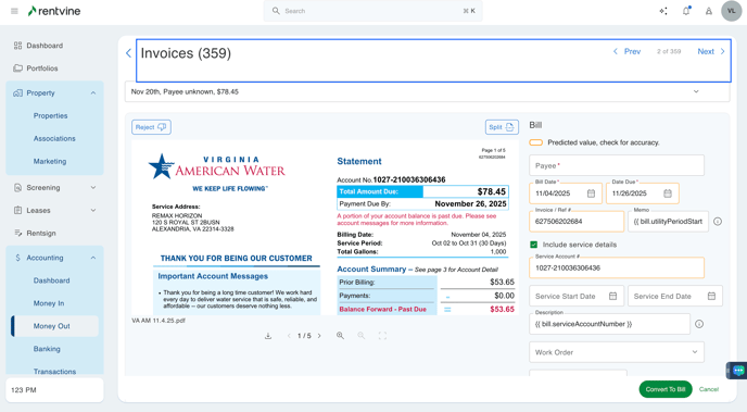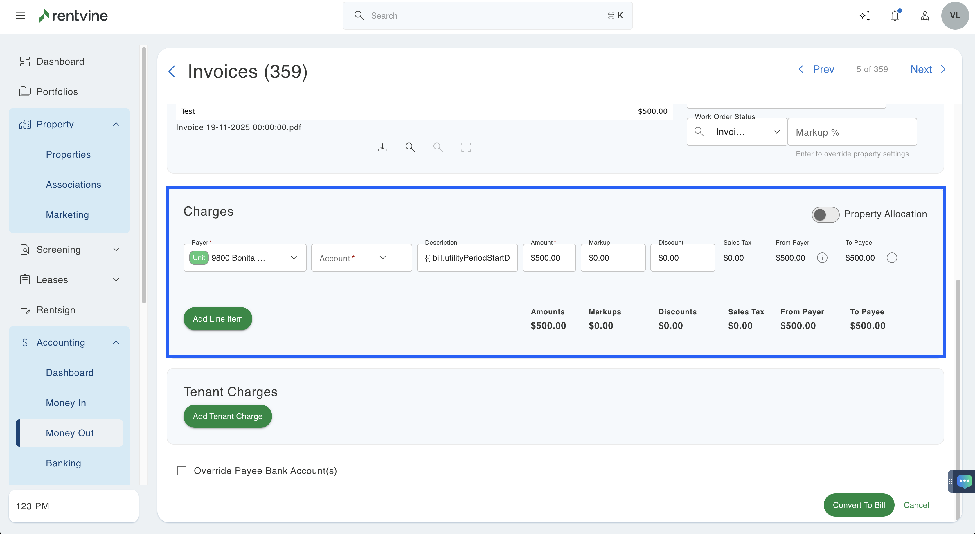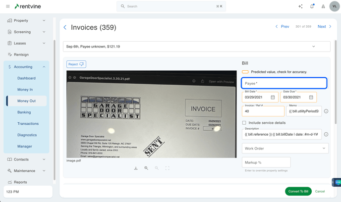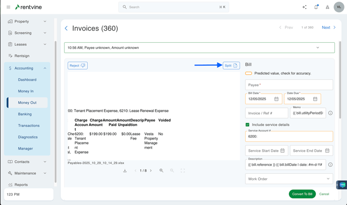 - Within the accounting money out tab, navigate to the vendor invoices page to view all invoices submitted by the vendor or manually uploaded into Rentvine by a user.
