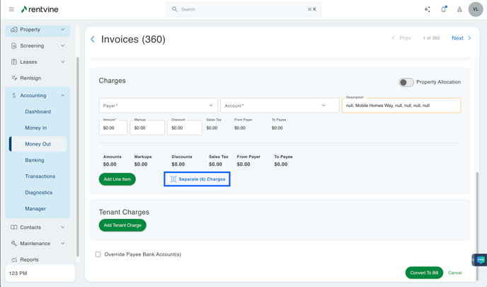 - When there is an invoice with multiple line items, the system will default to putting all charges under one line item in bill creation. If you would like to separate these charges into individual line items, you can click the "Separate Charges" button under the charges section. This will prefill all necessary information.