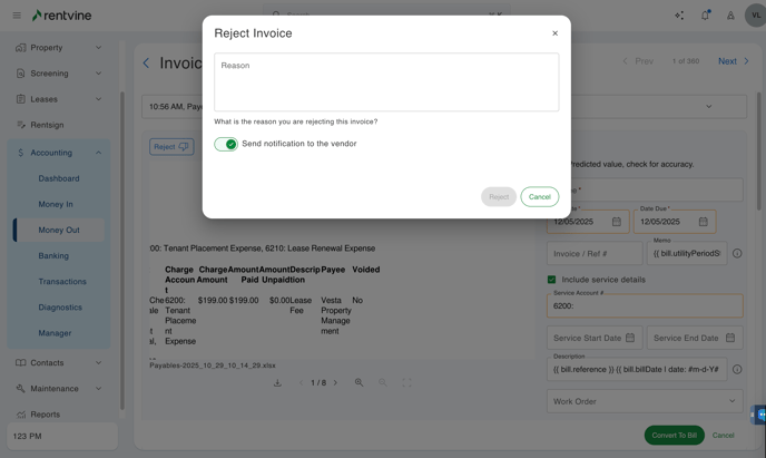 - For an individual invoice, there is a reject option available. Clicking on this will delete the invoice, allowing you to provide a reason for the rejection and promptly notify the vendor.