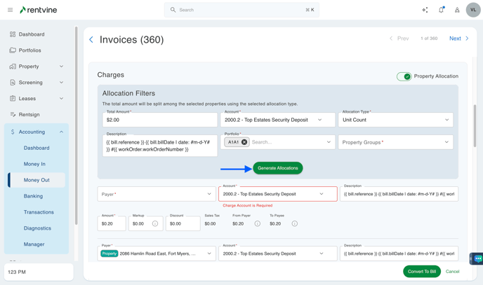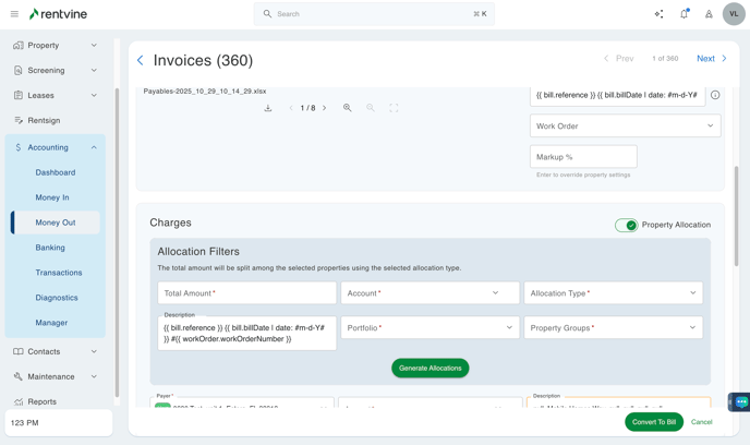 - When processing an individual invoice, you have the option to allocate the bill among the properties in a portfolio as needed. This step allows you to divide the invoice in a way that suits your requirements. You can specify the total amount, account, allocation type, description, portfolio, and property groups for accurate allocation.