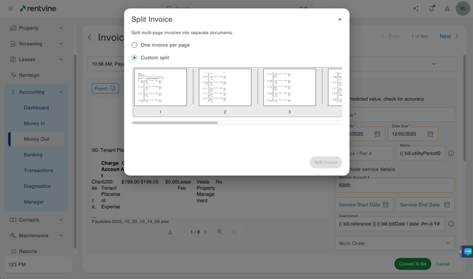 - Custom Split- This will allow you to select how you would like to split the invoice. You can create as many splits as you want and split the pages wherever needed.